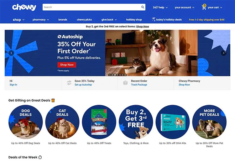 Although it’s called “Dog,” Dog.com also offers cat supplies. It regularly runs promotions with discounts of up to 75%, has a deep discount section, and offers free shipping on orders over $69.