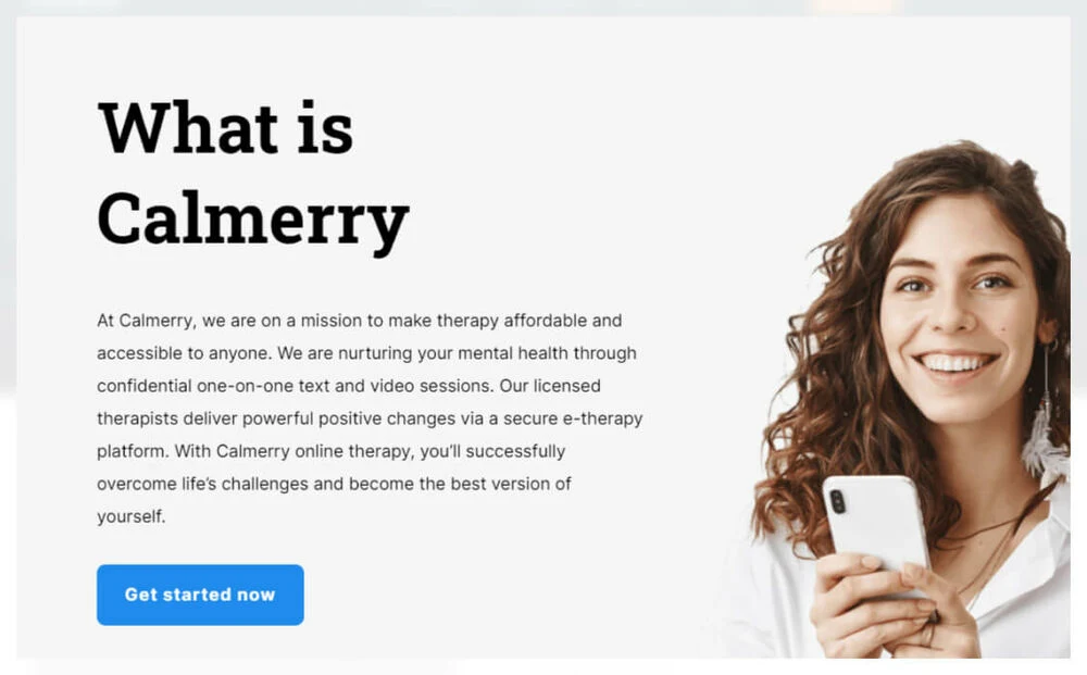 Calmerry is an online therapy network whose therapists are trained in a variety of specialties, including grief therapy, couples therapy, and LGBTQ+ therapy. They offer two ways to connect with therapists: text messages and video sessions.
