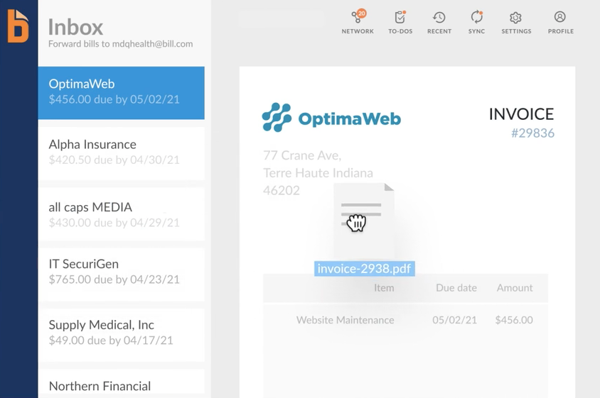 Bill.com has a feature called Inbox that allows suppliers to electronically send their invoices to a unique email address created by Bill.com. Inbox on Bill.com (Source: Bill.com)