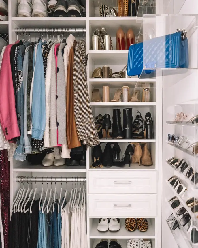 I wanted white wood, chrome hardware, two soft-close jewelry drawers, dozens of shoe compartments, double hanging rods, multiple adjustable shelves for shoes and bags, and a pull-out belt and tie rack.