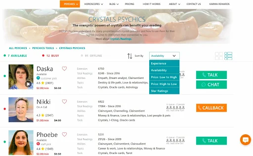 Reader profiles also include reviews and ratings from previous readings. You can sort them by highest to lowest (though there are often too many to get to the bottom, if any), most recent ratings, or chat and phone ratings. California Psychics reviews are often more comprehensive than other sites, helping you understand whether a psychic is right for you or if they are the right psychic for you.