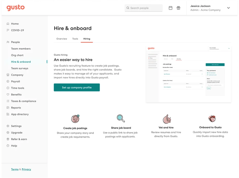 Gusto helps you build your dream team with tools for recruiting, onboarding, and talent development.