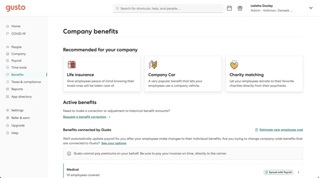 Offers a variety of HR tools and benefits, from onboarding and time tracking to 401(k) and health insurance tools.