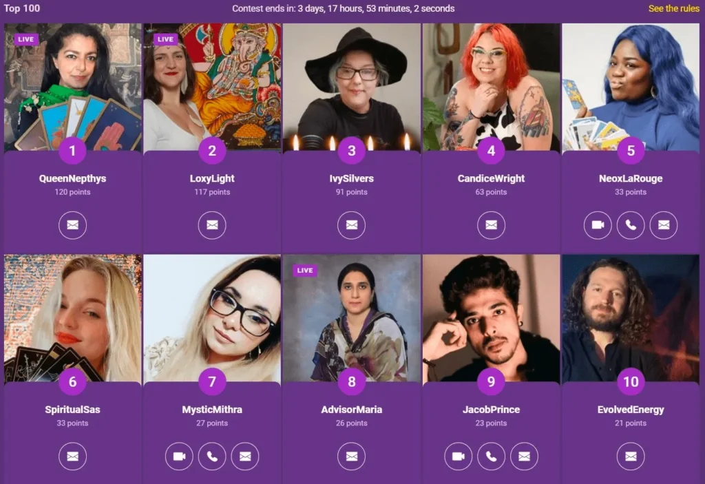 - A ranking system of the top 100 psychics so you can see which psychics are the most popular among other users.