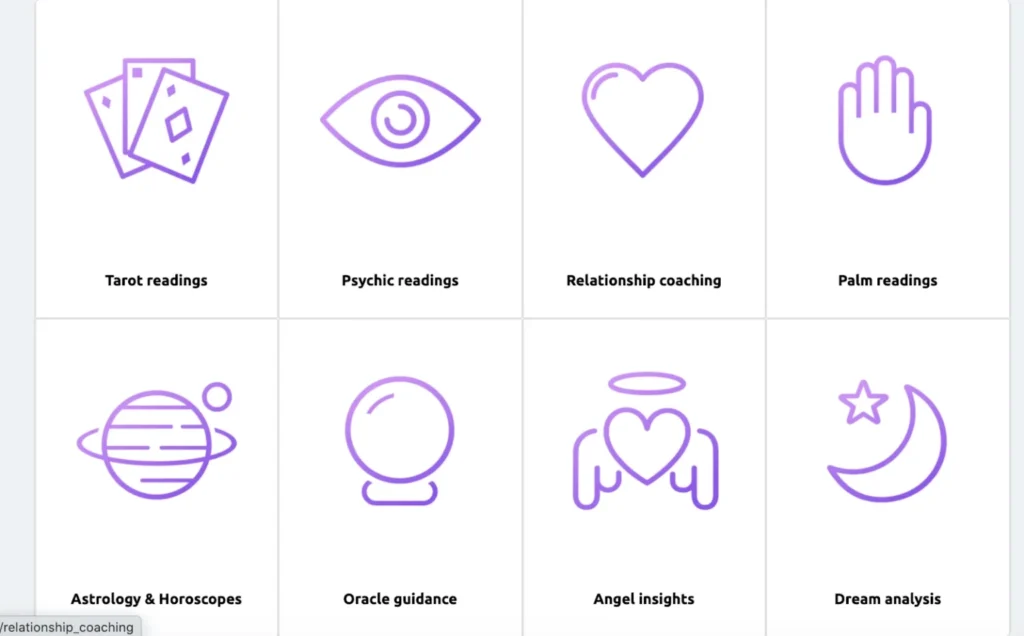 The main categories of readings are: fortune telling, tarot card readings, relationship coaching, palm readings, astrology and horoscopes, psychic guidance, angelic visions and dream analysis. There are also many subcategories in which readers specialize, such as spiritual counseling, career guidance, relationship counseling, swing readings, twin flame readings, chakra cleansing, life coaching, mediation, clairvoyance and energy healing.