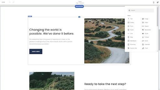 The editor is also relatively restrictive. For example, you can’t embed a video in the middle of a text field; instead, you have to create a separate video section. This can be frustrating at first, but it helps less experienced designers follow modern web design best practices and ensures that sites are mobile-friendly.